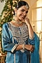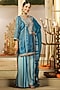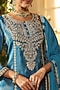 Featuring a teal kurta in shimmer tissue base with zari and dori embroidery, including a round neckline. It is paired with chinon silk sharara pants and a chiffon dupatta. Perfect for daytime weddings, festive celebrations, engagements, and family gatherings. Pair with pearl or kundan polki jewellery and nude heels for a graceful look.