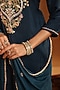 Featuring a teal A-line kurta in russian silk base with thread, beads and sequins hand embroidery. It is paired with shantoon pants and a chiffon dupatta. Perfect for daytime weddings, festive celebrations, engagements, and family gatherings. Pair with pearl or kundan polki jewellery and nude heels for a graceful look.