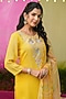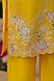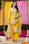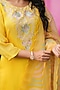 Featuring a yellow straight kurta in shimmer tissue base with floral and thread embroidery, including a round neckline. It is paired with shantoon pants and a chiffon dupatta. Perfect for daytime weddings, festive celebrations, engagements, and family gatherings. Pair with pearl or kundan polki jewellery and nude heels for a graceful look.