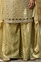 Featuring a pista green kurta in net base with zari and mirror stones embellishments. It is paired with matching shantoon flared palazzo pants and a chiffon dupatta.