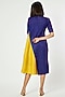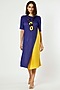 Featuring a dark blue and yellow midi dress in polyester base with dual layering.