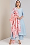 Featuring a light blue A-line fit and flare kurta in polyester base. It is paired with matching straight pants and a scalloped dupatta.