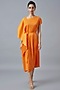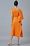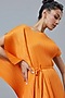 Featuring an orange midi dress in polyester base with cap sleeves and an asymmetrical drape. It is paired with a matching belt.