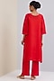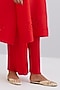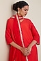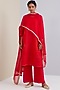 Featuring a red A-line kurta in polyester base with floral cutwork detailing and embellishments. It is paired with matching pants and a chiffon dupatta.