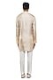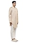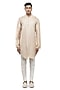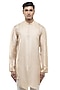 Featuring a beige asymmetric pleated kurta in silk base with mother of pearl buttons, stand collar and concealed placket. It is paired with pants. Style it up with mojaris for a festive occasion, wedding or pooja ceremony, exuding charm and elegance.
