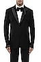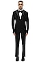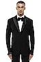 Featuring a black tuxedo jacket in satin base with peak detail. It is paired with a wing-tip shirt and trousers. Accentuate it with pair of shoes, a brooch and a watch for a reception ceremony.