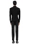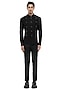 Featuring a black bandhgala in suiting base with a stand collar, concealed placket, metallic buttons and straight hem. It is paired with a shirt and trousers. Accentuate it with pair of loafers, a brooch and a bracelet for a wedding or sangeet ceremony.
