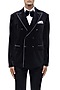 Featuring a navy blue tuxedo jacket in velvet base with peak lapel detail. It is paired with a wing-tip shirt and trousers. Accentuate it with pair of shoes, a brooch and a watch for a reception ceremony.
