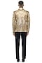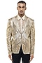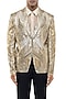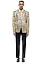 Featuring a golden single-breasted tuxedo in silk base with embroidery, peak lapel and mother of pearl button. It is paired with pants. Accentuate it with a pair of shoes, a brooch and a watch for a reception ceremony.
