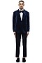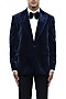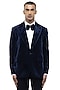 Featuring a navy blue tuxedo jacket in velvet base with peak lapel detail. It is paired with a wing-tip shirt and trousers. Accentuate it with pair of shoes, a brooch and a watch for a reception ceremony.