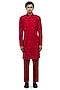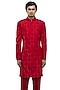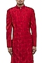 Featuring a red sherwani in silk base with a stand collar, concealed placket, mother pearl buttons, floral embroidery, bead and thread embellishment. It is paired with a kurta and pants. Accentuate it with a pair of mojaris and safa for a wedding, sangeet or engagement ceremony.