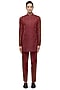 Featuring a red sherwani in silk base with a stand collar, concealed placket, mother pearl buttons, bead and thread embroidery. It is paired with a kurta and pants. Accentuate it with a pair of mojaris and safa for a wedding, sangeet or engagement ceremony.