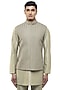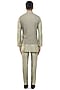 Featuring a sage green bundi jacket in silk base with a stand collar, concealed placket, mother pearl buttons, beads and thread work. It is paired with a kurta and pants. Accentuate it with a pair of kolhapuri sandals for a festive occasion, wedding, mehendi, sangeet or engagement ceremony.