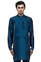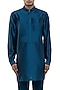 Featuring a teal blue kurta in silk base with a stand collar, concealed placket and mother pearl buttons. It is paired with pants. Accentuate it with a pair of kolhapuri sandals for a festive occasion, wedding, sangeet or engagement ceremony.