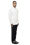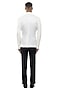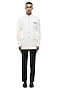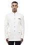Featuring a white bandhgala in suiting base with a stand collar, american placket, metallic buttons and straight hem. It is paired with a shirt and pants. Accentuate it with pair of loafers, a brooch and a bracelet for a wedding or sangeet ceremony.