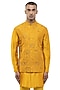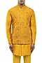 Featuring a yellow bundi jacket in georgette base with floral embroidery. It is paired with a kurta and pants. Accentuate it with pair of mojaris, a brooch and a bracelet for a wedding or haldi ceremony.