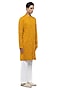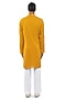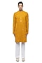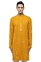 Featuring a yellow kurta in georgette base with floral embroidery, straight hem, mother of pearl buttons, stand collar and concealed placket. It is paired with pants. Style it up with mojaris for a festive occasion, wedding or pooja ceremony, exuding charm and elegance.
