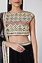 Featuring a black blouse in raw silk base with leather cut, colorful fabric patchwork, and embroidery. It is paired with a matching layered lehenga in georgette base and a net dupatta.