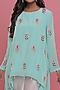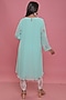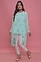 Featuring a light turquoise tunic in crepe, grand satin, and shantoon base with machine embroidery. It is paired with contrasting dhoti pants having lace work.