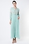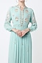 Featuring a powder blue pleated anarkali in georgette base with patchwork and leather applique hand embroidery. It is paired with matching pants.