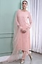 Featuring a rose pink kurta in georgette base with mirror, sequins, resham, and cutdana hand embroidery. It is paired with matching shantoon pants and net dupatta.