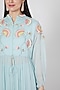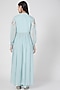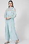 Featuring a sky blue tunic in georgette base with pearl buttons, leather applique, and fabric patch work hand embroidery. It is paired with matching pants.