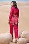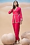 Featuring a peony pink tie-up blazer in satin and cotton base with zig-zag lace work. It is paired with pants. Accentuate with statement jewellery and heels for a brunch or any events.