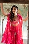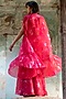 Featuring a peony pink cape in soft organza base with print. It is paired with a bustier and embroidered sharara pants. Style it with dangler earrings and heels for a complete look.