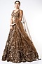 Featuring an antique gold lehenga in net base with floral print and sequins embroidery. It is paired with a matching blouse and a dupatta.