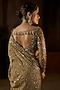Seema Gujral presents a stunning antique gold saree in shimmer georgette base with sequins, beads and crystal embroidery. It is paired with an embroidered blouse having crystal tassel detail and an underskirt. Style this luxurious saree with emerald jewellery, a sleek bun and minimal makeup to let the intricate craftsmanship shine, perfect for a majestic wedding phera look.