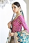 Featuring a blue lehenga in raw silk base with gota patti embroidery. It is paired with a contrasting pink blouse and green dupatta.