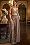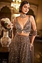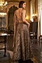 Seema Gujral presents a stunning brown bustier in net base with sequins, bugle beads and crystal embroidery. It is paired with embroidered sharara pants and a dupatta. Style this exquisite ensemble with luminous polki jewellery and refined makeup for a timeless look perfect for the most elite engagement soirees.