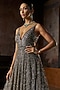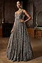Seema Gujral presents a stunning charcoal colored gown in net base with sequins, beads and crystal embroidery. Style this luxurious gown with diamond jewellery, a sleek bun and minimal makeup to let the intricate craftsmanship shine, perfect for elite sangeet soirees.
