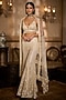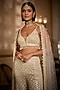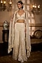 Seema Gujral presents a stunning cream bustier in net base with sequins and pearl embroidery. It is paired with embroidered sharara pants and a dupatta. Style this exquisite ensemble with luminous emerald jewellery, a sleek bun and refined makeup for a timeless look perfect for the most elite sangeet soirees.
