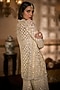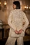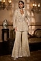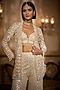 Seema Gujral presents a stunning cream jacket in net base with sequins and pearl embroidery. It is paired with an embroidered bustier and sharara pants. Style this exquisite ensemble with luminous emerald jewellery, a sleek bun and refined makeup for a timeless look perfect for the most elite sangeet soirees.