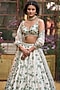 Seema Gujral features an emerald green lehenga in net base with floral thread and pearl embroidery. It is paired with a sleeveless embroidered blouse having tassels detail and a scalloped embroidered dupatta having scalloped floral jaal and tassels detail. Style this designer lehenga with an emerald kundan polki jewellery, a floral hairdo and embellished block heels for a wedding or engagement ceremony.