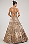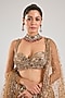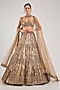 Featuring a gold lehenga in net base with crystal and sequins embroidery. It is paired with a blouse having crystal tassels detail and an embroidered dupatta. Accentuate it with swarovski or zircon jewellery, embellished heels and a clutch for a cocktail look, Perfect wear for a wedding, cocktail or sangeet ceremony.