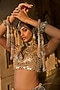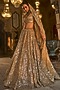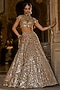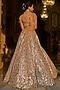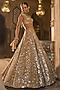 Seema Gujral presents a stunning gold lehenga set crafted in organza, adorned with mirror and abstract embroidery. This eye-catching ensemble features a blouse having cap sleeves and tassels, paired with a tissue organza scalloped dupatta. Style with statement kundan or polki jewelry, a sleek bun, and dewy makeup for a regal look. Perfect for weddings or engagement ceremonies.