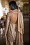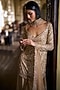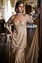 Seema Gujral presents a stunning gold kurta in tissue silk base with sequins, crystal and stone embroidery. It is paired with embroidered sharara pants and an organza dupatta. Style this exquisite ensemble with luminous polki jewellery and refined makeup for a timeless look perfect for the most elite engagement soirees.