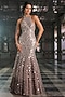 Featuring a grey gown in net base with mirror embroidery in abstract pattern. Style this designer gown with zircon dangler earrings, an embellished clutch and strappy heels, perfect for a evening soirees, red-carpet or high fashion events.