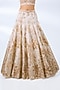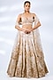 Featuring an ivory lehenga in organza base with gold, floral applique and motif embroidery. It is paired with an embroidered halter blouse and an embroidered dupatta. Accentuate it with swarovski or zircon jewellery, embellished heels and a clutch for a cocktail look, Perfect wear for a wedding, cocktail or sangeet ceremony.