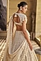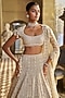 Featuring an ivory lehenga in organza base with pearl embroidery. It is paired with an embroidered blouse having cape sleeves and exaggerated pearl tassels. including a dupatta. Accentuate it with swarovski or zircon jewellery, embellished heels and a clutch for a cocktail look, Perfect wear for a wedding, cocktail or sangeet ceremony.