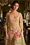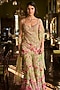 Seema Gujral presents a stunning leaf green top in net and tulle base with tassel detail. It is paired with floral three dimensional sequins and thread embroidered sharara pants and an embroidered dupatta. Style this exquisite ensemble with luminous polki jewellery, a sleek bun and refined makeup for a timeless look perfect for the most elite mehendi soirees.
