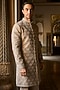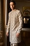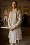 Featuring an ash grey sherwani in raw silk base with sequins, beads and thread embroidery. It is paired with a kurta, pants, footwear and an organza dupatta. Style it with pair of mojaris for a wedding or engagement ceremony.