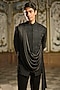 Featuring a black bandhgala in suiting and raw silk base with bugle beads and thread embroidery. It is paired with a giza cotton shirt, a detachable satin drape and straight pants. Style it with sleek loafers or embroidered mojaris and a subtle statement brooch for a sharp, modern look. Perfect for cocktail evenings, wedding receptions, sangeet nights or grand festive celebrations.