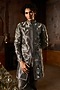 Featuring a charcoal colored sherwani in textured silk base with tonl zari embroidery. It is paired with a kurta, straight pants and a pair of shoes. A style rooted in tradition is perfect for weddings, sangeet or engagement ceremonies, exuding regal charm.