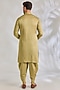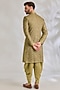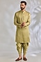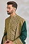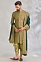 Featuring a gold and green sherwani in silk base. It is paired with a kurta, dhoti pants and a dupatta. Accentuate it with mojaris and malas for a wedding or engagement ceremony.