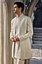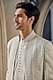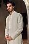 Featuring a grey sherwani in silk base with dori embroidery. It is paired with a silk embroidered kurta and brocade straight pants. Style it up with mojaris for a wedding, sangeet or engagement ceremony.
