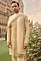 Featuring an ivory sherwani in silk base with sequins, bugle beads and thread embroidery. It is paired with a kurta, pants, footwear and an organza dupatta. Style it with pair of mojaris for a wedding or engagement ceremony.