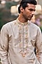 Featuring a nude kurta in raw silk base with french knot, threadwork and sequins embroidery. It is paired with ivory cotton silk straight pants. Style it with kolhapuri sandals for a festive occasion, cultural event, wedding or engagement ceremony.